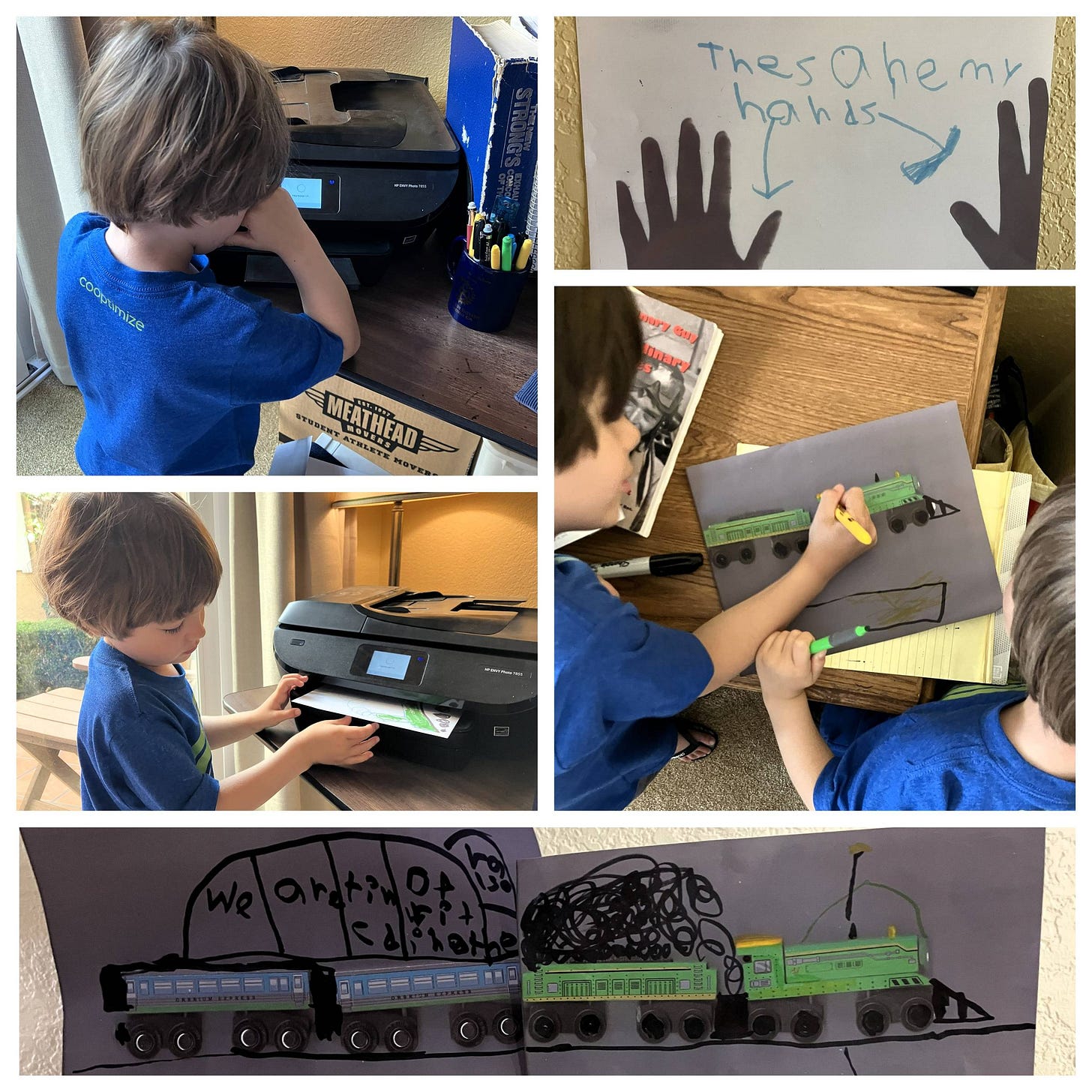 Calvin and Lawrence also made copies of their trains. That’s not so surprising—after hands, trains are probably the most likely non-flat thing Calvin and Lawrence would copy. It was surprising to watch them mark up their copied trains. They used highlighters to make the train colors pop off the page. They used Sharpies to add train modifications and speech bubbles. Then they taped their train copies to the walls.